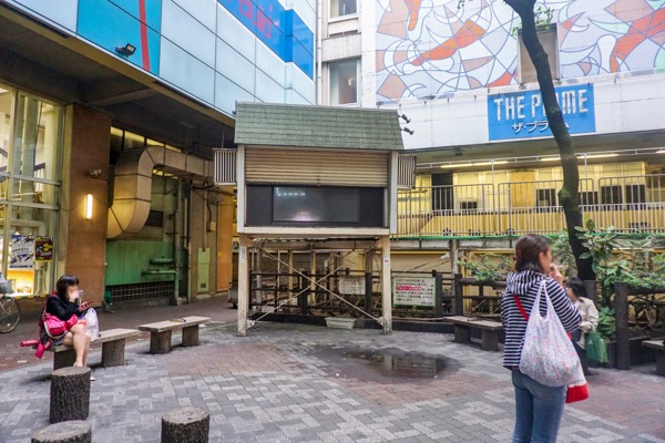 藤沢駅近くの名店ビルの中庭に謎のボックスがあります/藤沢のレトロな駅隣接ビル、名店ビルが気になる。中に入ると昭和ぽいし広場には街頭テレビがあるし、本当に名店沿いかも(カープさん/そろそろ旅さん)