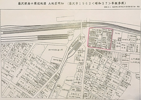 1962年の藤沢駅南口周辺。ピンクで囲んだのは藤沢391番地