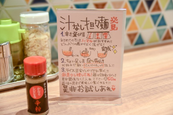 汁なし坦々麺は太麺なので、麺を茹でるのに6分、1杯作るのに約7分かかる。その間に食べ方や調味料を確認しておくといいだろう。