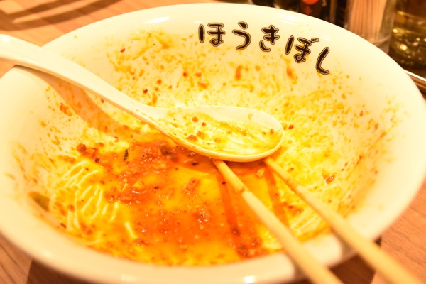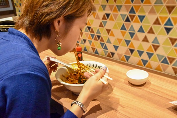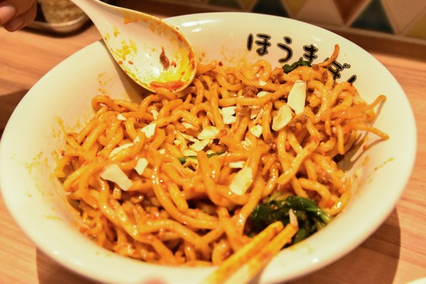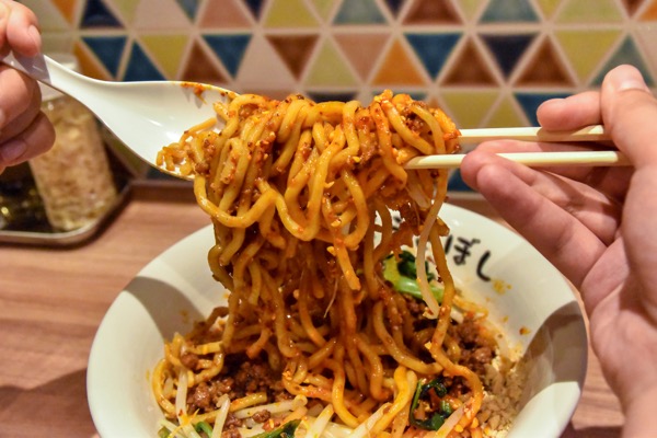 美味しい!! 口の周り真っ赤になるくらい、しっかりと辛い。何種類もの香辛料と山椒が効いていて、ピリッとしびれる辛さがクセになる。すするっていうより、食らい付く! って感じだ。もっちりとした太麺を噛むたびに頭皮からじわっと汗がにじんできた。