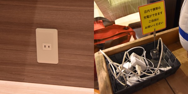 充電器の貸し出しと各席の足下にはコンセントが用意されている