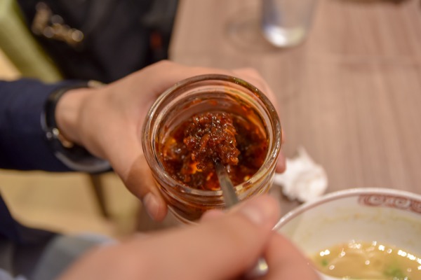 味に変化をつけたいときは、小エビの入った自家製ラー油を入れると良い。辛さを重視したラー油ではないので、鶏白湯がかなり濃厚な分、多めに入れるのがオススメ。
