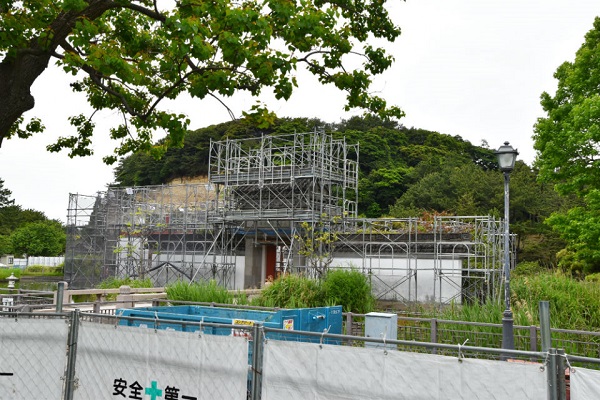 本牧市民公園の「上海横浜友好園」の工事。改修工事とのことですが、現場の看板には“新築工事”と記載。老朽化を理由に立ち入り不可でしたが、工事後はどうなるのか、気になります(濱俊彦さんのキニナル)