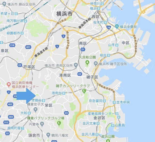 「だいちゃん広場」のある栄区小菅ケ谷(青矢印、Googlemapより)