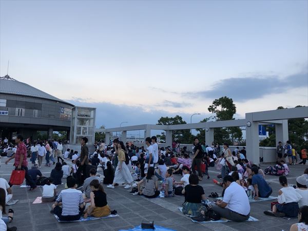 浴衣を着たカップルから子ども連れの家族、会社終わりに駆けつけたであろうスーツ姿の男性もいる。フリーエリアには飲み物とトイレが近くにあるため困ることはなさそうだ。