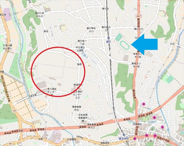 善行駅近くの神奈川県立体育センター(青矢印)、投稿の荏原製作所は赤丸(© OpenStreetMap contributors)