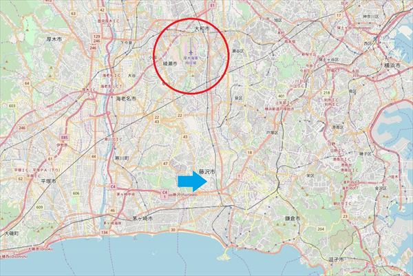 投稿の「藤沢飛行場」があった場所(青矢印)、厚木米海軍飛行場が赤丸(© OpenStreetMap contributors)