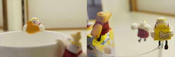 2018(平成30)年3月に新発売となった「黒塀の鳩兵衛」は、お尻の部分に小さな溝があり、コップのふちにかけたりして遊ぶフィギュア。7種のポーズとシークレット(ミスターH)3種の計10種類を展開し、「食べるぞ!鳩兵衛」「波乗り鳩兵衛」「ぶらさがり鳩兵衛」など、各鳩兵衛にちゃんと名前がついている。