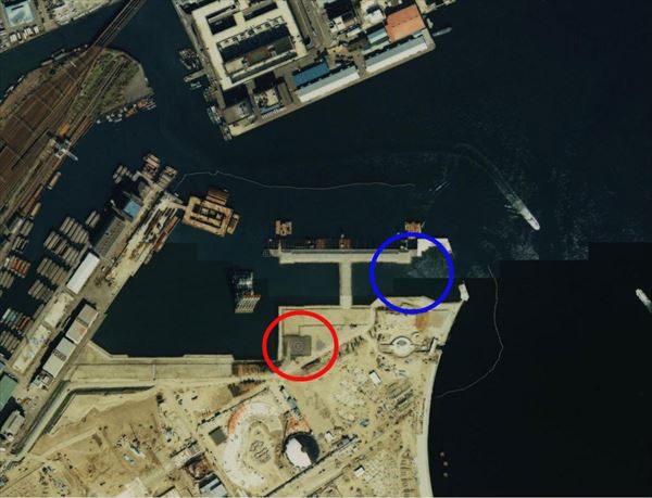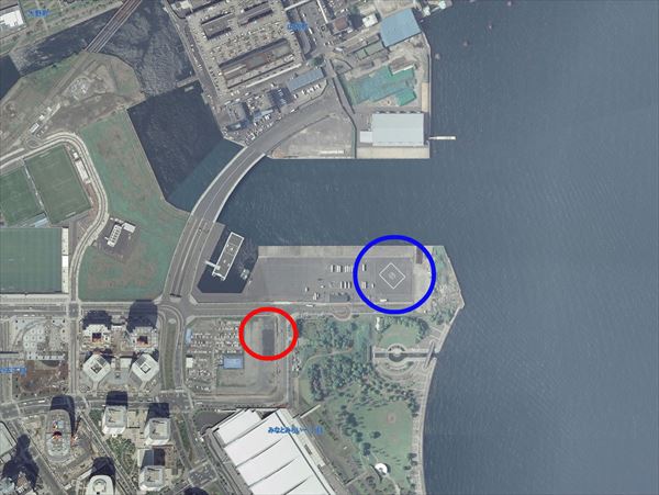 国土地理院が公開している航空写真には横浜博の工事期間中の様子が残されており、当時のヘリポートが確認できる。現在のヘリポートとの位置をおおまかに比較してみた(当時のヘリポートは赤丸、現在のヘリポートが青丸)。