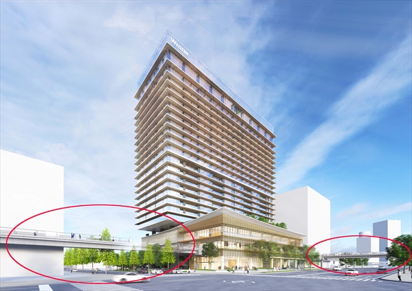 ホテルの完成予想図では、ホテルから別の施設に伸びる歩行者用デッキ(以下、ペデストリアンデッキ)の姿が描かれている。どこにつながっているのだろう?