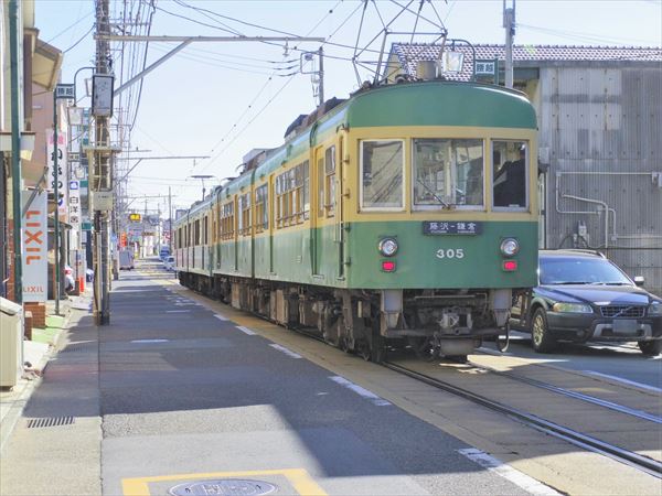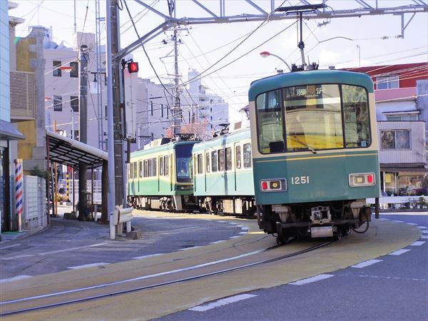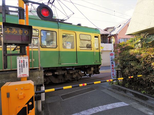 知っている人も多いと思うが、江ノ島電鉄線では江ノ島(えのしま)駅から腰越駅までの一区間が自動車と一緒の道路を走る「併用軌道」という区間になっている。