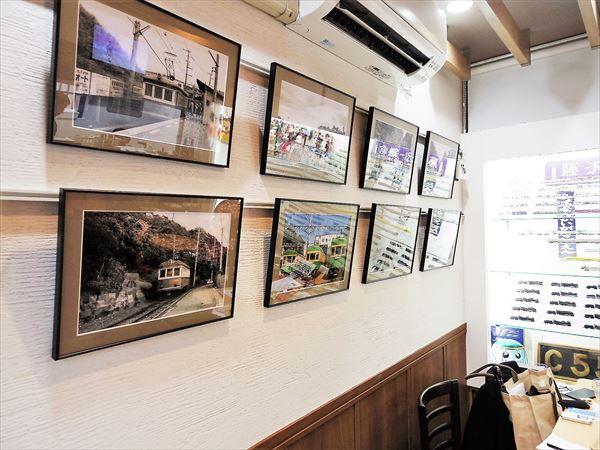 店内に入るとまず目に入るのが左側の壁にかけられたたくさんの江ノ電の写真!今では走っていない車両の姿もあり、懐かしく感じる人もいるに違いない!