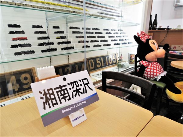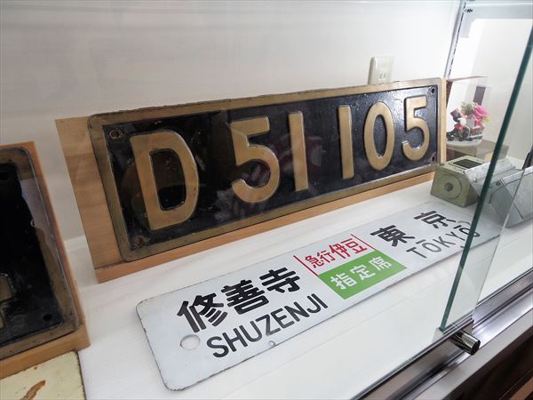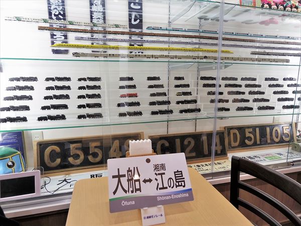 そして次に目に入るのが、ケースに並べられたたくさんの鉄道模型!上段は江ノ電の歴代の車両が飾られているが、真ん中の段は子どもたちに人気の「ドクターイエロー」や「スーパービュー踊り子」など江ノ電とは関係ない鉄道模型の姿もある。そして下の段にはマニアにうれしい、実際に使用されていたナンバープレートや特急電車のサイドボード(行き先や列車名を表示する板)が展示されている。
