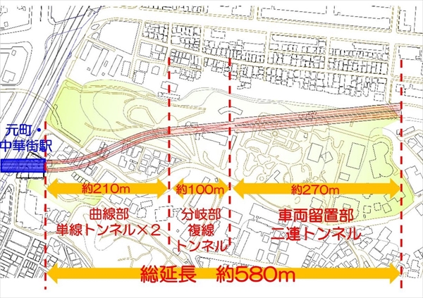 計画図によれば、みなとみらい線の終点である元町・中華街駅の先にトンネルを構築し、港の見える丘公園の下にスペースを設けることになっている。トンネルの先端部が4線に分かれており、4編成が留め置ける構造だ(残り2編成は、元町・中華街駅のホームに留め置く)。