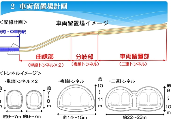計画では、車両留置場も「二連トンネル」で工事の負担を小さくするなど、工法にも工夫をこらそうとしているようだ。トンネルを掘る技術は日々進歩しており、その中から地上への影響が少なく、なによりも安全なものを選択するために、検討を続けるそうだ。