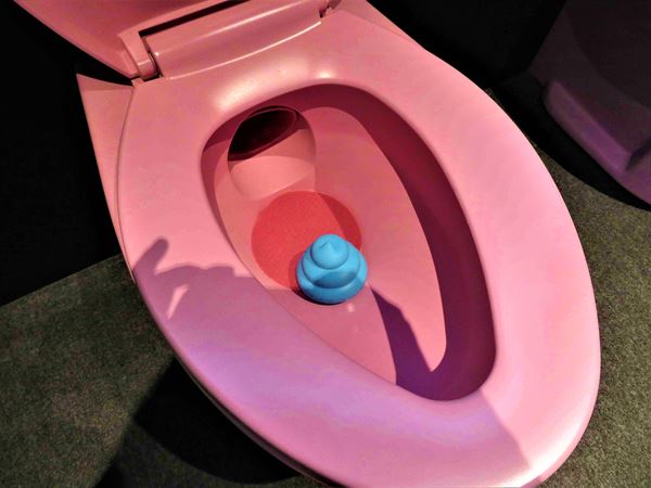 いよいよ未知なる体験がスタートする。ズラリ並んだ6色の便器の中から、好きな色を選んで座り、ふんばるよう指示される。人前で便座に座るのも、ふんばるのも、物心ついてからは初めてだ。とりあえずいつもの体勢をとってみた。