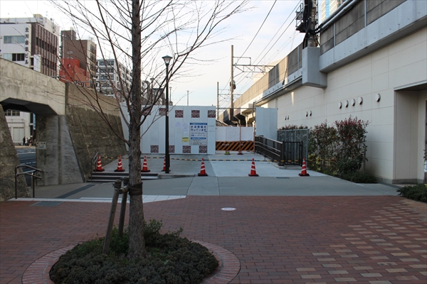 西口広場の北側、紅葉坂方向の部分では、いまも工事が行われている。この奥の階段から、すぐ左側の高架の上に行けるようになるはずだ。