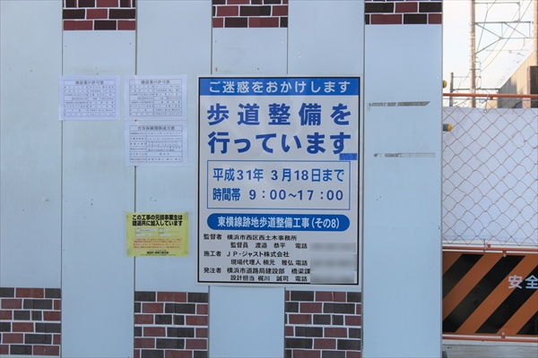 工事現場の様子をうかがうと、確かに「歩道整備を行っています」という表示が。そして、工事期間は「平成31年3月18日まで」とある。