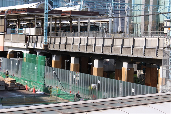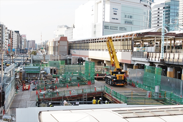 桜木町駅南側の国道沿いでは、新改札と駅前複合ビルの建設工事が同時進行中! 新改札前から馬車道方面へつながる新たな歩道橋の整備も進んでいた