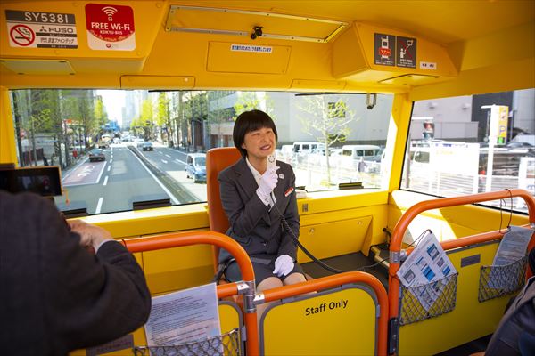 試乗会は横浜市庁舎の駐車場から出発し、みなとみらいを周遊後、大黒ふ頭で折り返す約40分の特別ルート。筆者は屋根のないバスに乗るのも、こんなに大きいバスに乗るのも初めてだったので、乗車前からワクワクが止まらない。