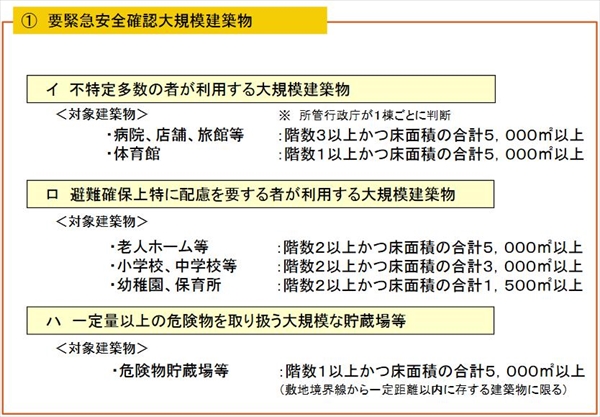 病院・店舗・宿泊施設に学校や老人ホームなどが対象になる「要緊急安全確認大規模建築物」