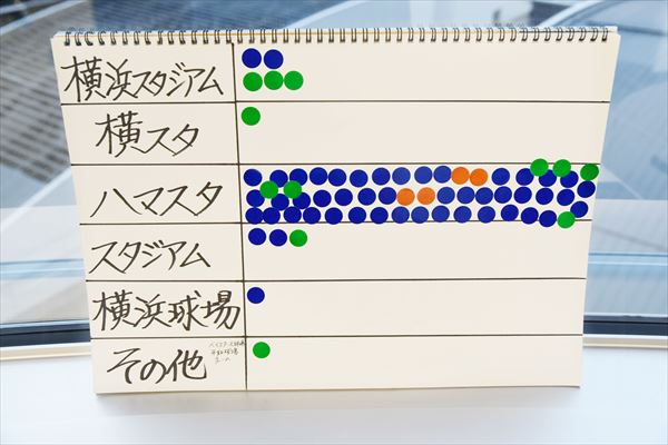 そして結果は以下の通り。ブルーのシールはベイスターズファン、赤いシールはカープファン、加えてはまれぽ編集部内(緑のシール)でも投票を行った。しめて120票!