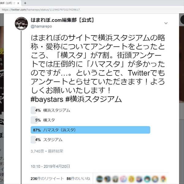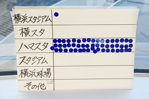 3740票のうち、ハマスタが87パーセント(3253票)、横スタが5パーセント(187票)、横浜スタジアムとスタジアムが4パーセント(150票)だった。