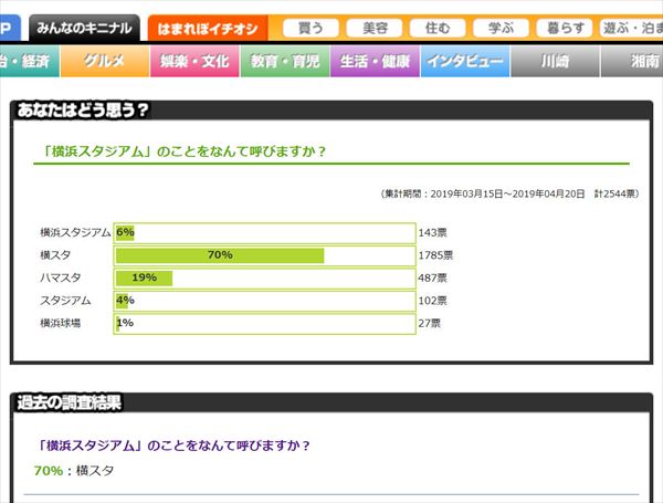 ネットの力も借りた今回のアンケート、総数は6453票。うち、ハマスタが3875票、横スタが1975票、横浜スタジアムが299票、スタジアムが275票、平和球場を含むその他が29票だった(票数順)。