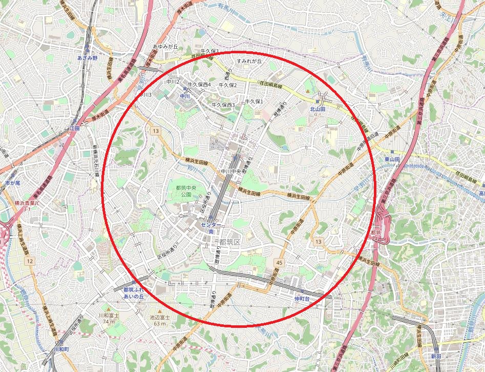 今回の調査エリア。センター北、センター南駅を中心にした赤丸あたり(© OpenStreetMap contributors)
