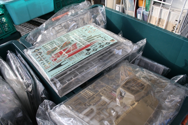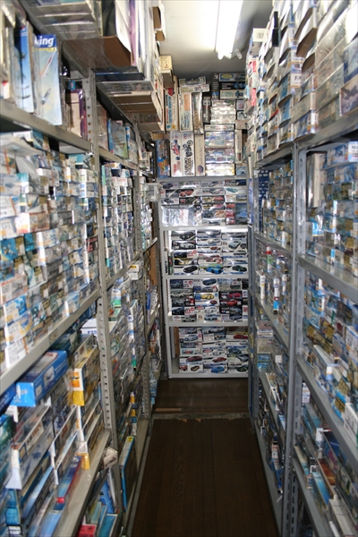 「こんにちは」と店内に入ると、人が1人やっと歩ける程度の通路が確保されている。店内は、上から下まで、ビッシリとプラモデルの箱が積み上げられていた。