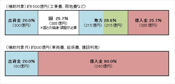 事業の費用負担は、概算事業費を約1800億円として、以下のような内訳になる。