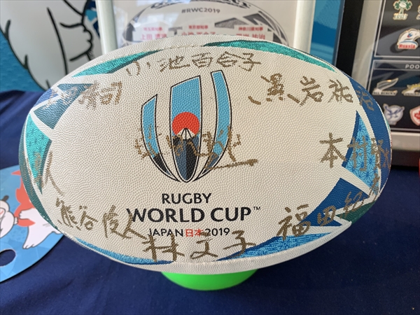 東京・有楽町のラグビー応援フェアで黒岩知事や林市長のサイン入りボールを発見