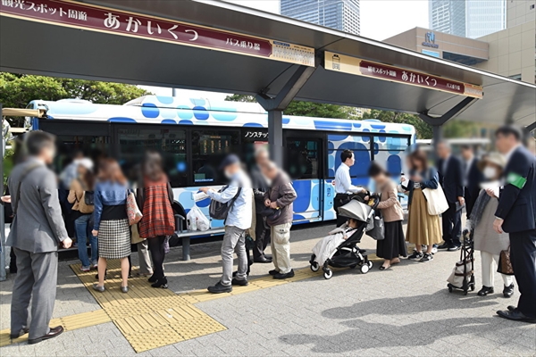 「ピアライン」は、桜木町駅前バスターミナルの4番のりばから乗車できる。「あかいくつ」バスと同じバス停だ。