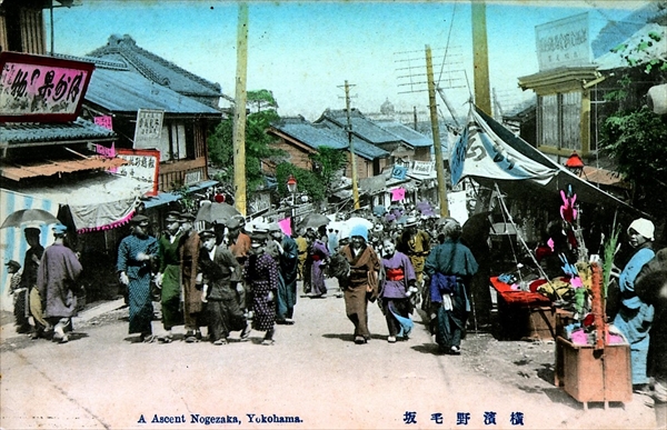 当時の西参道をとらえた写真や絵葉書は見つからなかった。そのかわり、近辺の野毛坂の明治後期から大正期ごろの盛況ぶりを伝える一枚を紹介しておこう。