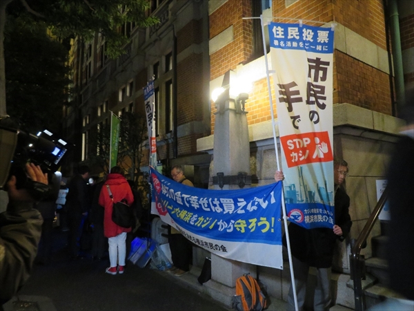 カジノ誘致を宣言したこの日は、反対を訴える市民約70人が横浜市役所市長室前に駆けつけ、2時間にわたって職員との押問答が繰り広げられた。市長に面会を求める市民に対し市長は現れず、市長室に突入しようとする騒動にまでなった。