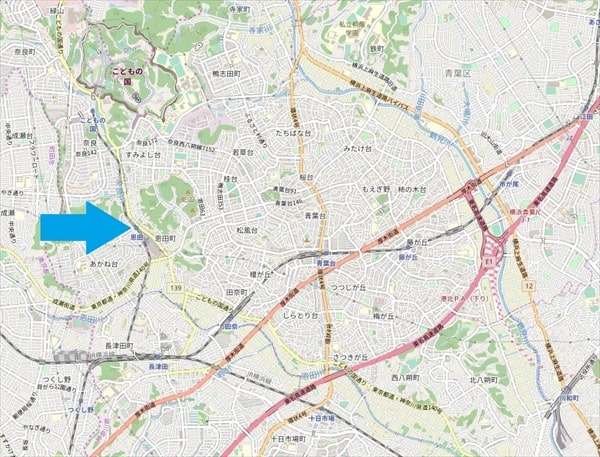 青矢印が万年寺があるという青葉区恩田(© OpenStreetMap contributors)