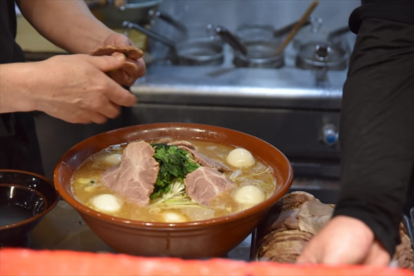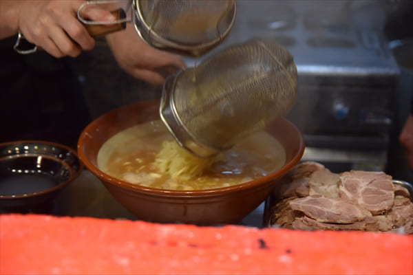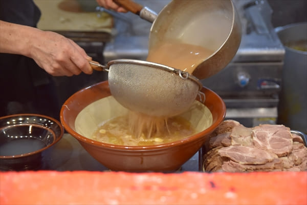 すり鉢状の大きな丼にスープが注がれていく