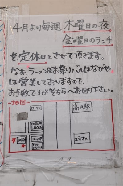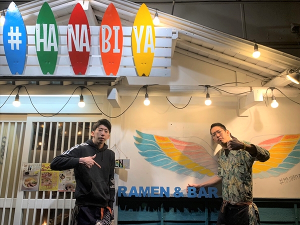 1号店「ラーメン&お祭りバル はなびや」の案内が貼られている