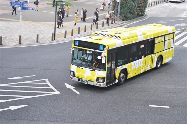 下船客の移動に使われた黄色いラッピングの市営バス(画像は過去記事より)