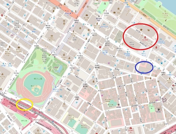 そのなかでもっとも中心的なエリアは、赤丸で囲った山下町界隈だったようだ。