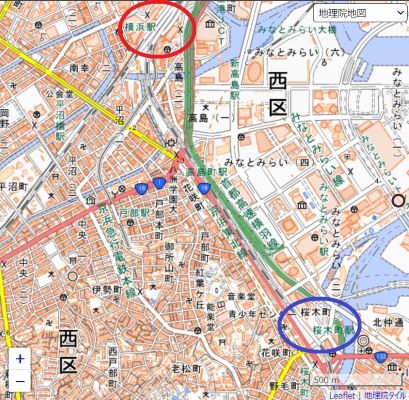現在の地図。青枠内が桜木町駅(『今昔マップon the web』より)