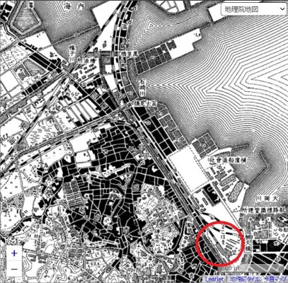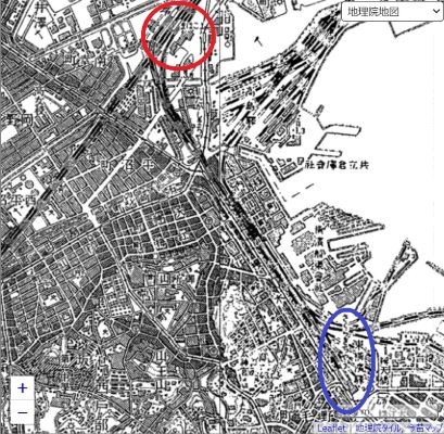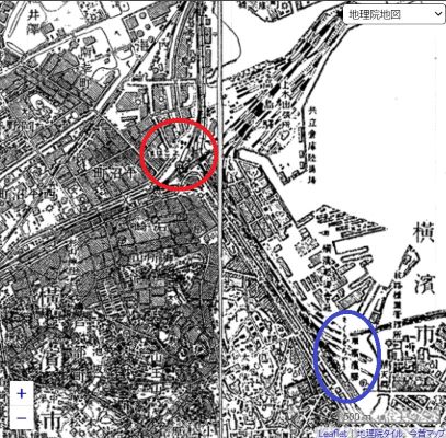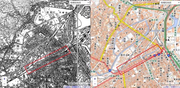 下の2枚の地図を比べると、そのことが一目瞭然だろう。いずれも赤枠内にあるのが各時代の横浜駅だ。