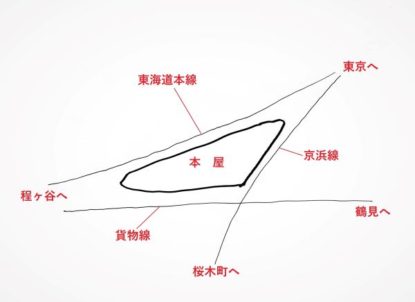 また、同駅は東海道線ホームと京浜線ホームが駅舎を挟むような形で敷かれ、これに上記の貨物線を加えた3路線によって囲まれた本屋の敷地は、今日から見ても珍しい三角を形づくっている。