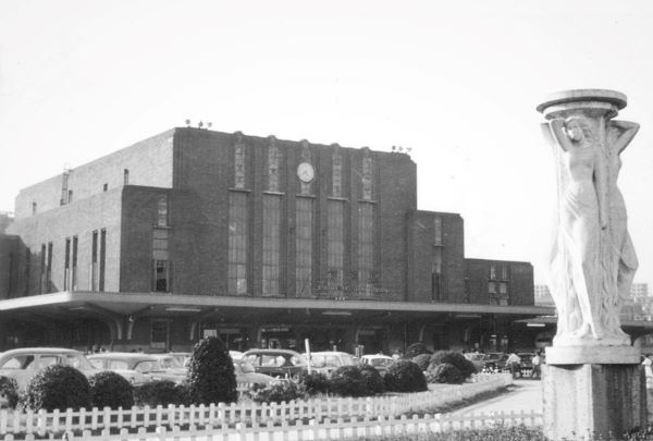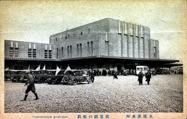 当時の三代目横浜駅の表玄関は東口だった。まだ駅前広場は未整備で地面に砂利が敷かれているが、建物は鉄筋コンクリート2階(一部3階)建て、正面に高い吹き抜けと広いコンコースを持つ典型的な昭和初期のモダニズム建築だ。