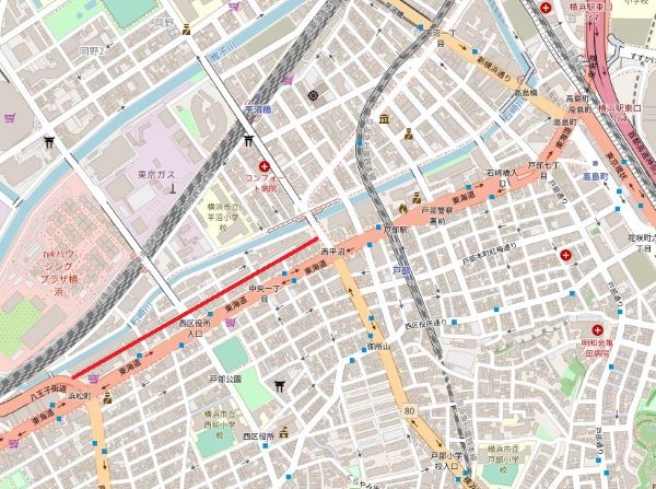 この先、石崎川と国道1号線にはさまれた一帯には、水道局桜木ポンプ場、戸部警察署、西消防署などの大きな建物を擁する敷地が、かつての鉄路を覆うような格好で並んでいた。