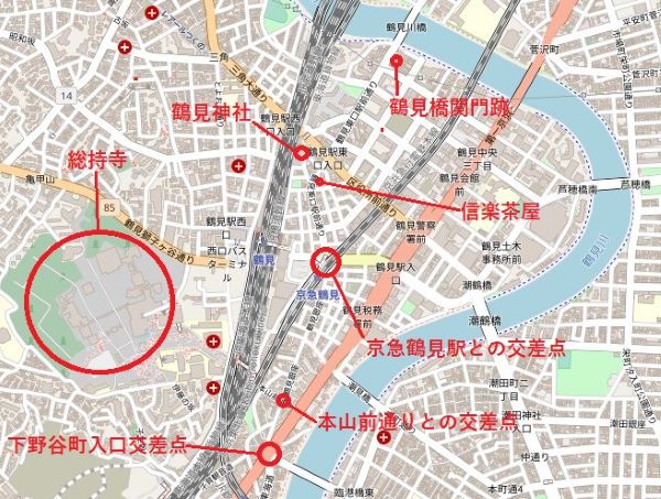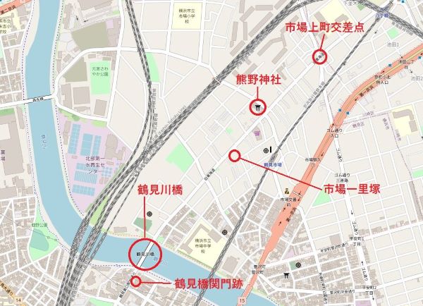 市場上町交差点から鶴見橋関門跡までは、距離にしてわずか1kmあまり。