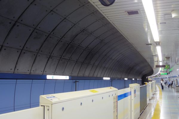 ブルーライン高島町駅は1976年に開業したが、地下埋設物や地盤、国道1号線との関係でシールド工法により建設。線路ごとにトンネルを掘ったため、ホームは同じ階なのに2分割されている。