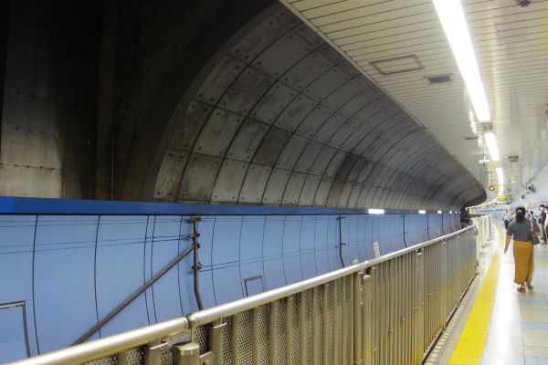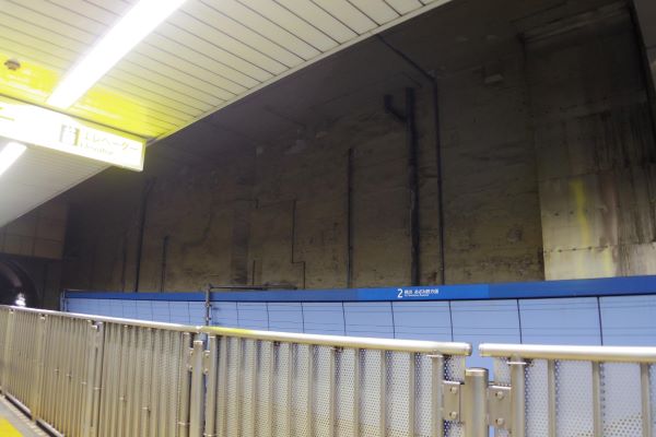 ホームの反対側、電車が停まる側の壁を見てみると、コンクリートのブロックが寸分違わず敷き詰められているのがわかる。これこそシールド工法で建設された何よりの証拠だ。
