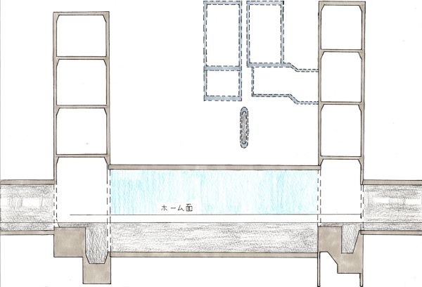 取材時にはホーム部のシールドトンネル断面図も見せてもらった。しかし一般向けの図ではないとのことだったので、筆者が独自に簡略化して描いてみた。手描きなので多少の誤差があるものの、トンネルはほぼ真円になっており、一般利用者からは見えない底部は平らにコンクリートが敷き詰められているようだ。