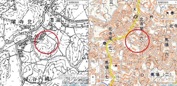 ここでは掲載できないが、図書館にあった1958(昭和33)年度版の『鶴見区明細地図』の中に、上遠牡丹園の表示があった。それをもとに1932(昭和7)年と現在の地図を時系列地形図で並べてみると、下の地図の赤い円内が、ざっくりではあるがかつて上遠牡丹園があった辺りと推察できる。